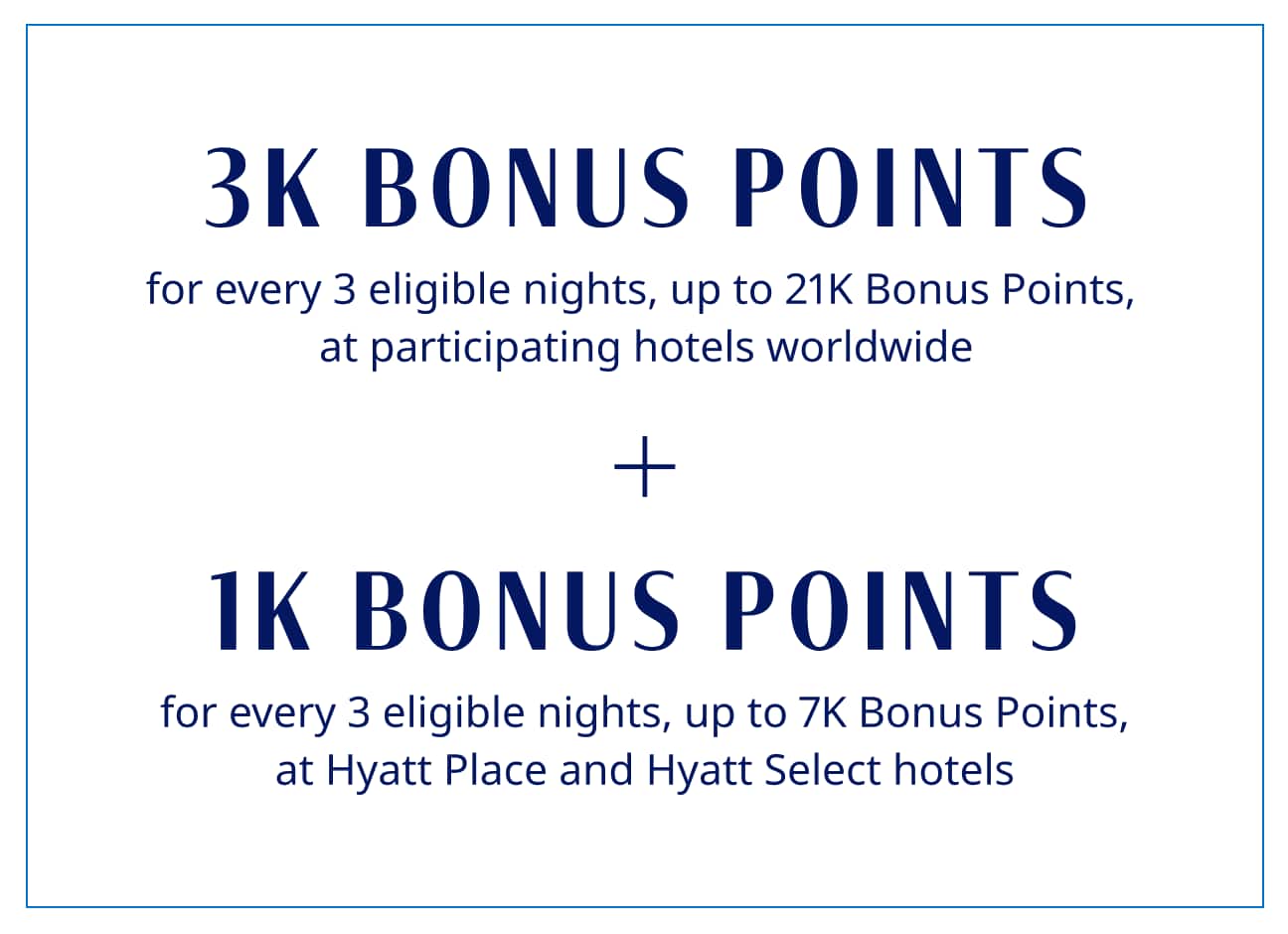 - An additional 1,000 Bonus Points for every 3 Eligible Nights at Hyatt Place and Hyatt Select hotels (up to 7,000 Bonus Points).