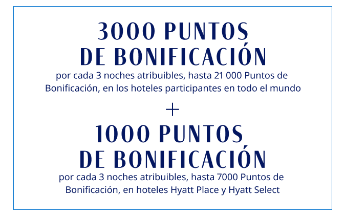 - 1000 Puntos de Bonificación adicionales por cada 3 Noches Atribuibles, hasta 7000 Puntos de Bonificación, en hoteles Hyatt Place y Hyatt Select.