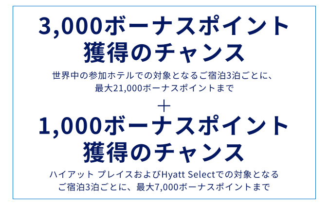 - ご登録後、2026年2月2日から2026年4月15日の間に対象となるご滞在を終了すると、対象となる3泊ごとに3,000ボーナスポイント(最大21,000ボーナスポイント)、さらにハイアット プレイスおよびHyatt Selectのホテルでの対象となる3泊ごとに追加で1,000ボーナスポイント(最大7,000ボーナスポイント)をご獲得いただけます。
