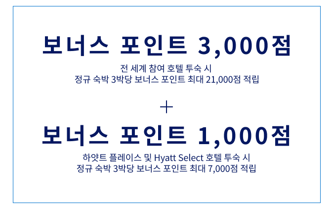- 등록 후 2026년 2월 2일부터 2026년 4월 15일 사이에 정규 숙박을 완료하면 정규 숙박 3박당 보너스 포인트 3,000점(최대 보너스 포인트 21,000점까지)이 적립되며, 하얏트 플레이스 및 Hyatt Select 호텔에서는 완료한 정규 숙박 3박당 보너스 포인트 1,000점(최대 보너스 포인트 7,000점까지)을 추가로 적립해 드립니다.