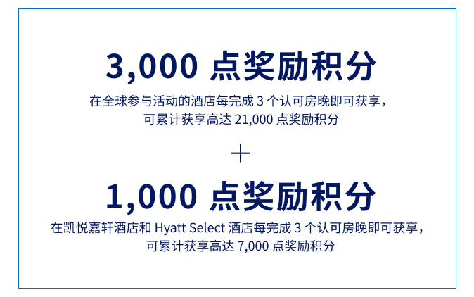 - 在凯悦嘉轩酒店和 Hyatt Select 酒店每完成 3 个认可房晚还可额外获享 1,000 点奖励积分(至多可累计获享额外 7,000 点奖励积分)。